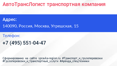 АвтоТрансЛогист, транспортная компания по адресу 140090, Россия, Москва, Угрешская, 15 в дальнейшем Организация, размещена в следующих категориях: