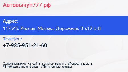Автовыкуп777.рф по адресу 117545, Россия, Москва, Дорожная, 3 к19 ст8 в дальнейшем Организация, размещена в следующих категориях: