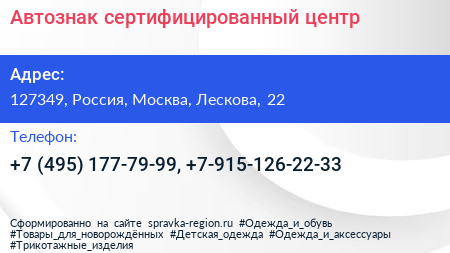 Автознак, сертифицированный центр по адресу 127349, Россия, Москва, Лескова, 22 в дальнейшем Организация, размещена в следующих категориях: