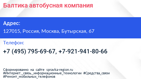 Балтика, автобусная компания по адресу 127015, Россия, Москва, Бутырская, 67 в дальнейшем Организация, размещена в следующих категориях: