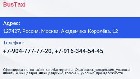 BusTaxi по адресу 127427, Россия, Москва, Академика Королёва, 12 в дальнейшем Организация, размещена в следующих категориях: