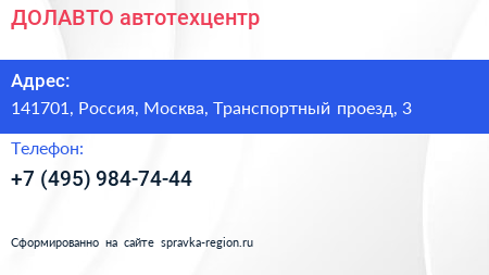 ДОЛАВТО, автотехцентр по адресу 141701, Россия, Москва, Транспортный проезд, 3 в дальнейшем Организация, размещена в следующих категориях: