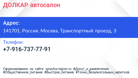 ДОЛКАР, автосалон по адресу 141701, Россия, Москва, Транспортный проезд, 3 в дальнейшем Организация, размещена в следующих категориях: