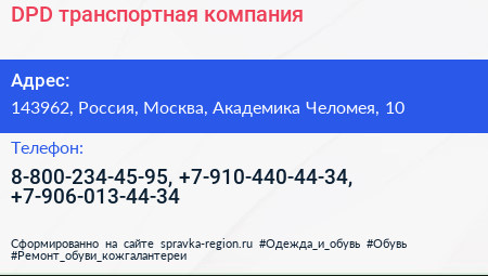 DPD, транспортная компания по адресу 143962, Россия, Москва, Академика Челомея, 10 в дальнейшем Организация, размещена в следующих категориях: