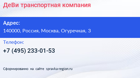 ДеВи, транспортная компания по адресу 140000, Россия, Москва, Огуречная, 3 в дальнейшем Организация, размещена в следующих категориях: