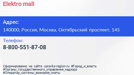 Elektro-mall по адресу 140000, Россия, Москва, Октябрьский проспект, 145 в дальнейшем Организация, размещена в следующих категориях: