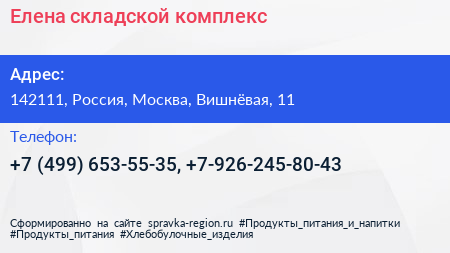 Елена, складской комплекс по адресу 142111, Россия, Москва, Вишнёвая, 11 в дальнейшем Организация, размещена в следующих категориях: