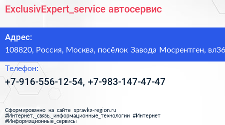 ExclusivExpert_service, автосервис по адресу 108820, Россия, Москва, посёлок Завода Мосрентген, вл36 в дальнейшем Организация, размещена в следующих категориях: