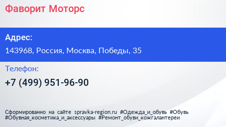 Фаворит Моторс по адресу 143968, Россия, Москва, Победы, 35 в дальнейшем Организация, размещена в следующих категориях: