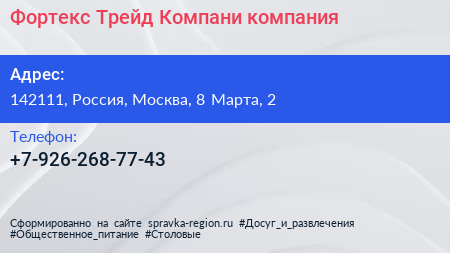 Фортекс Трейд Компани, компания по адресу 142111, Россия, Москва, 8 Марта, 2 в дальнейшем Организация, размещена в следующих категориях: