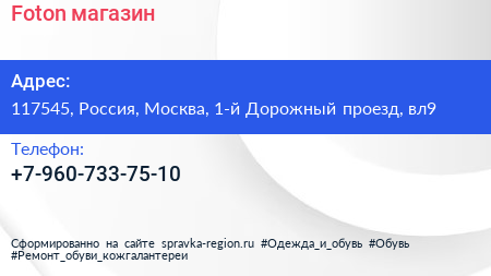Foton, магазин по адресу 117545, Россия, Москва, 1-й Дорожный проезд, вл9 в дальнейшем Организация, размещена в следующих категориях: