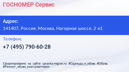 ГОСНОМЕР Сервис по адресу 141407, Россия, Москва, Нагорное шоссе, 2 к1 в дальнейшем Организация, размещена в следующих категориях: