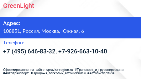 GreenLight по адресу 108851, Россия, Москва, Южная, 6 в дальнейшем Организация, размещена в следующих категориях: