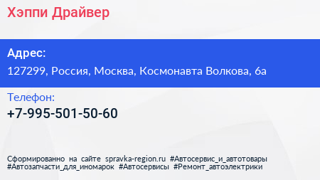 Хэппи Драйвер по адресу 127299, Россия, Москва, Космонавта Волкова, 6а в дальнейшем Организация, размещена в следующих категориях: