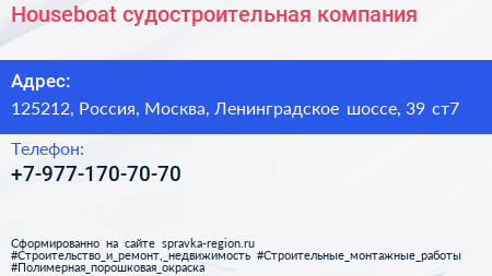Houseboat, судостроительная компания по адресу 125212, Россия, Москва, Ленинградское шоссе, 39 ст7 в дальнейшем Организация, размещена в следующих категориях: