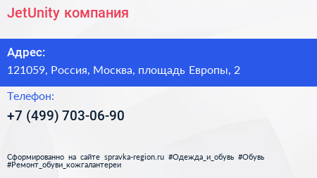 JetUnity, компания по адресу 121059, Россия, Москва, площадь Европы, 2 в дальнейшем Организация, размещена в следующих категориях: