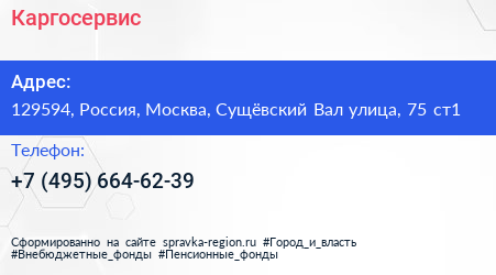 Каргосервис по адресу 129594, Россия, Москва, Сущёвский Вал улица, 75 ст1 в дальнейшем Организация, размещена в следующих категориях: