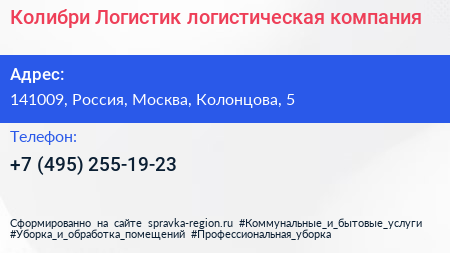Колибри Логистик, логистическая компания по адресу 141009, Россия, Москва, Колонцова, 5 в дальнейшем Организация, размещена в следующих категориях: