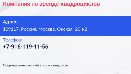 Компания по аренде квадроциклов по адресу 109117, Россия, Москва, Окская, 20 к2 в дальнейшем Организация, размещена в следующих категориях: