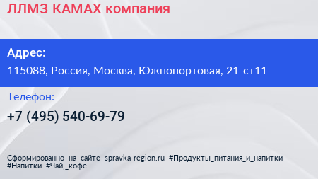 ЛЛМЗ-КАМАХ, компания по адресу 115088, Россия, Москва, Южнопортовая, 21 ст11 в дальнейшем Организация, размещена в следующих категориях:
