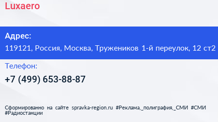 Luxaero по адресу 119121, Россия, Москва, Тружеников 1-й переулок, 12 ст2 в дальнейшем Организация, размещена в следующих категориях:
