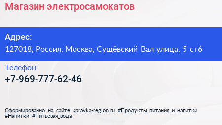 Магазин электросамокатов по адресу 127018, Россия, Москва, Сущёвский Вал улица, 5 ст6 в дальнейшем Организация, размещена в следующих категориях: