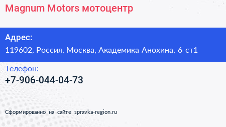 Magnum Motors, мотоцентр по адресу 119602, Россия, Москва, Академика Анохина, 6 ст1 в дальнейшем Организация, размещена в следующих категориях: