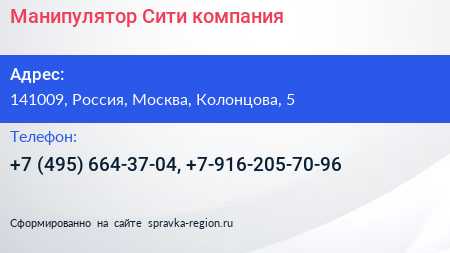 Манипулятор Сити, компания по адресу 141009, Россия, Москва, Колонцова, 5 в дальнейшем Организация, размещена в следующих категориях: