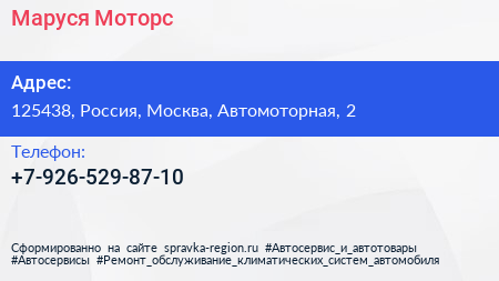 Маруся-Моторс по адресу 125438, Россия, Москва, Автомоторная, 2 в дальнейшем Организация, размещена в следующих категориях: