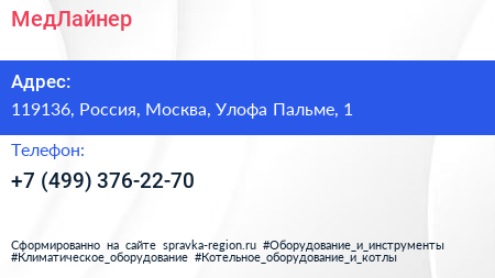 МедЛайнер по адресу 119136, Россия, Москва, Улофа Пальме, 1 в дальнейшем Организация, размещена в следующих категориях: