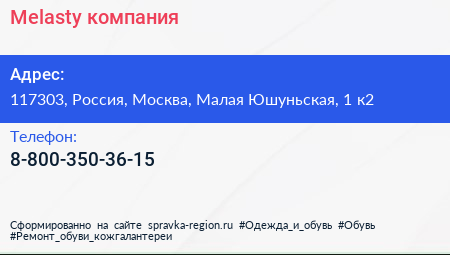 Melasty, компания по адресу 117303, Россия, Москва, Малая Юшуньская, 1 к2 в дальнейшем Организация, размещена в следующих категориях:
