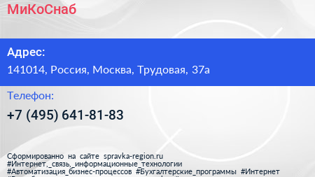 МиКоСнаб по адресу 141014, Россия, Москва, Трудовая, 37а в дальнейшем Организация, размещена в следующих категориях: