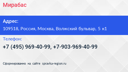 Мирабас по адресу 109518, Россия, Москва, Волжский бульвар, 5 к1 в дальнейшем Организация, размещена в следующих категориях:
