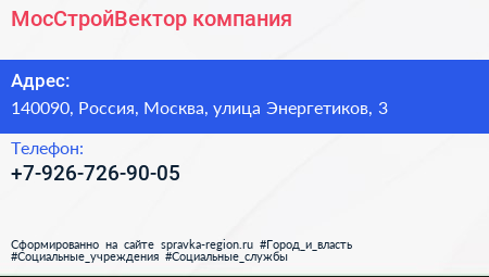 МосСтройВектор, компания по адресу 140090, Россия, Москва, улица Энергетиков, 3 в дальнейшем Организация, размещена в следующих категориях: