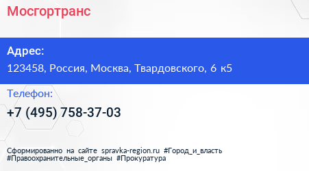 Мосгортранс по адресу 123458, Россия, Москва, Твардовского, 6 к5 в дальнейшем Организация, размещена в следующих категориях: