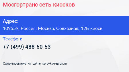 Мосгортранс, сеть киосков по адресу 109559, Россия, Москва, Совхозная, 12Б киоск в дальнейшем Организация, размещена в следующих категориях: