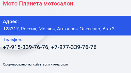 Мото Планета, мотосалон по адресу 123317, Россия, Москва, Антонова-Овсеенко, 6 ст3 в дальнейшем Организация, размещена в следующих категориях: