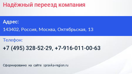 Надёжный переезд, компания по адресу 143402, Россия, Москва, Октябрьская, 13 в дальнейшем Организация, размещена в следующих категориях: