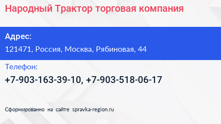 Народный Трактор, торговая компания по адресу 121471, Россия, Москва, Рябиновая, 44 в дальнейшем Организация, размещена в следующих категориях: