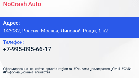 NoCrash Auto по адресу 143082, Россия, Москва, Липовой Рощи, 1 к2 в дальнейшем Организация, размещена в следующих категориях: