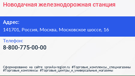 Новодачная, железнодорожная станция по адресу 141701, Россия, Москва, Московское шоссе, 16 в дальнейшем Организация, размещена в следующих категориях: