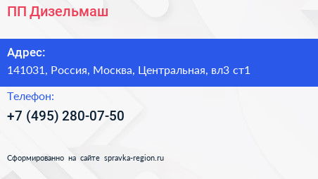 ПП Дизельмаш по адресу 141031, Россия, Москва, Центральная, вл3 ст1 в дальнейшем Организация, размещена в следующих категориях: