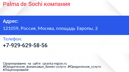 Palma de Sochi, компания по адресу 121059, Россия, Москва, площадь Европы, 2 в дальнейшем Организация, размещена в следующих категориях: