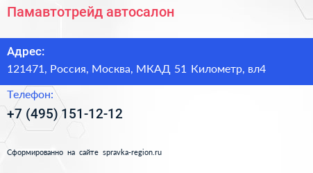 Памавтотрейд, автосалон по адресу 121471, Россия, Москва, МКАД 51 Километр, вл4 в дальнейшем Организация, размещена в следующих категориях: