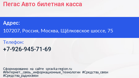 Пегас-Авто, билетная касса по адресу 107207, Россия, Москва, Щёлковское шоссе, 75 в дальнейшем Организация, размещена в следующих категориях: