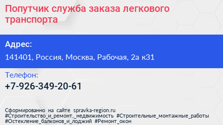Попутчик, служба заказа легкового транспорта по адресу 141401, Россия, Москва, Рабочая, 2а к31 в дальнейшем Организация, размещена в следующих категориях: