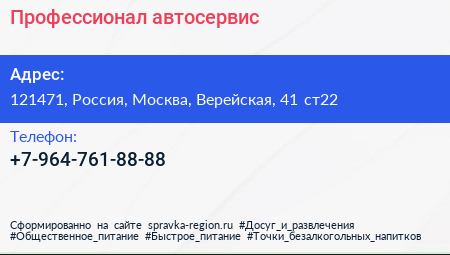 Профессионал, автосервис по адресу 121471, Россия, Москва, Верейская, 41 ст22 в дальнейшем Организация, размещена в следующих категориях: