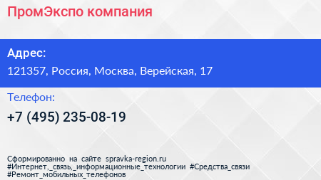 ПромЭкспо, компания по адресу 121357, Россия, Москва, Верейская, 17 в дальнейшем Организация, размещена в следующих категориях: