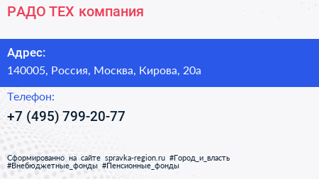 РАДО-ТЕХ, компания по адресу 140005, Россия, Москва, Кирова, 20а в дальнейшем Организация, размещена в следующих категориях: