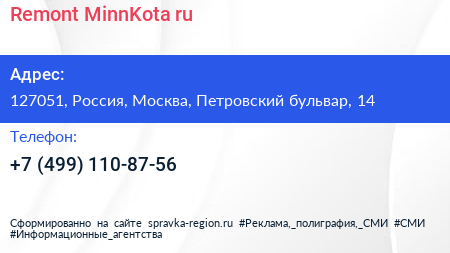 Remont-MinnKota.ru по адресу 127051, Россия, Москва, Петровский бульвар, 14 в дальнейшем Организация, размещена в следующих категориях: